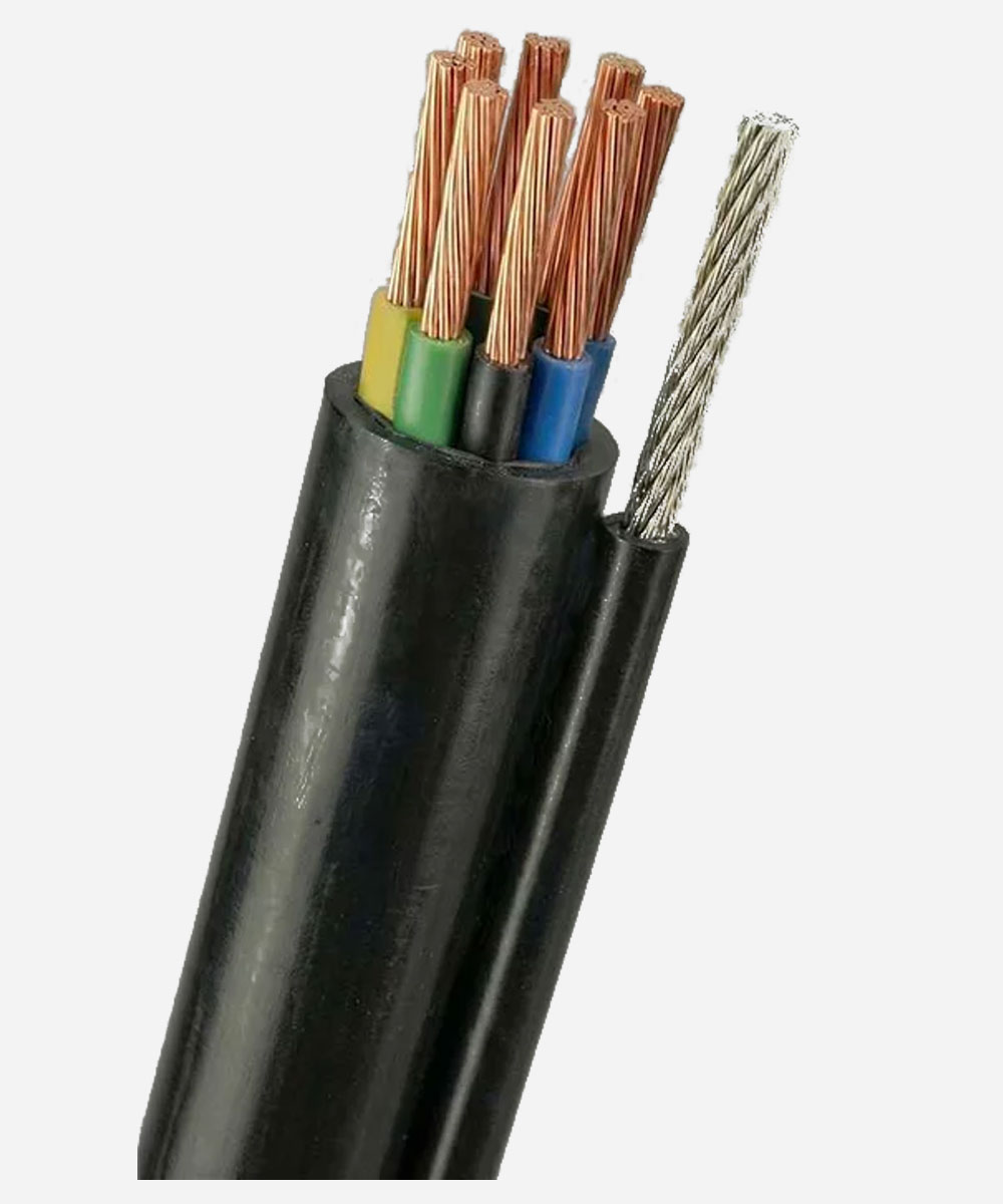 Круглый кабель используют на подвесах для управления кран балкой. В состав провода входят 1 или 2 металлических троса. Благодаря жестким вставкам, его трудно повредить. Желтый и зеленый проводник защищает прочная изоляция. Чтобы использование устройства было полностью безопасным, внутри провода установлен заземлитель.
